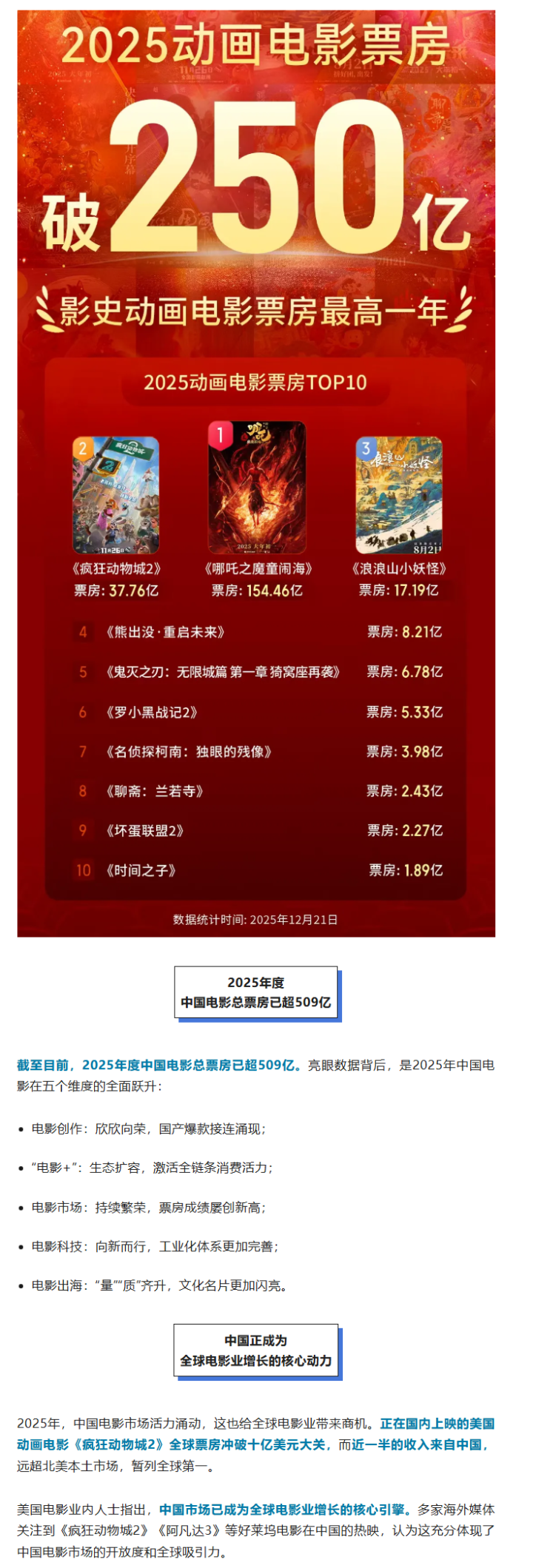 据央视新闻12月21日讯息足球投注app,据收集平台数据,2025年全年动画电影票房冲破250亿,成为中国影史动画电影票房最高一年。《哪吒之魔童闹海》《肆意动物城2》《浪浪山小妖魔》分列2025年动画电影票房榜前三位。