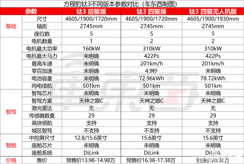 车东西3月31日音讯,就在刚刚,比亚迪方程豹钛3车型厚爱开启预售,新车定位硬派SUV,共有5个版块,预售价钱为13.98万元~20.38万元,新车计较于4月份厚爱上市并委派。