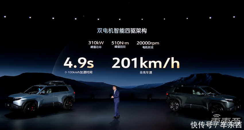 新车基于全新EVO+平台打造,可选双电机四驱系统,前交流异步电机最大功率为110kW,后永磁同步电机最大功率为200kW,系统总峰值功率为310kW,峰值扭矩为510N·m,零百加快时辰为4.9秒,最高车速可达201km/h。