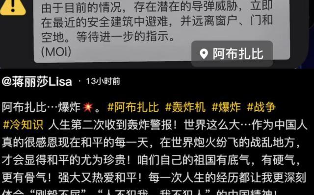 陈浩民和蒋丽莎一家那时在阿布扎比旅游,手机直接收到当地内务部的进攻警报,信息明确条款所有这个词东谈主坐窝就近投入安全建设侧目,远隔阳台、窗户和空旷处所。