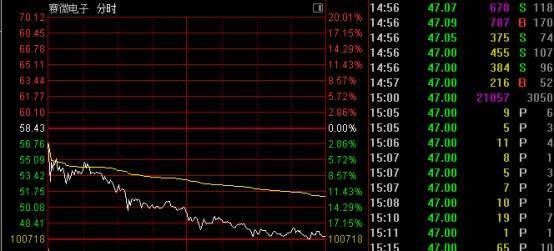 赛微电子(300456)盘中大幅跳水,一度涉及跌停。截止收盘,该股跌19.56%,成交近100亿元。此前的10个交游日,该股累计涨约118%。