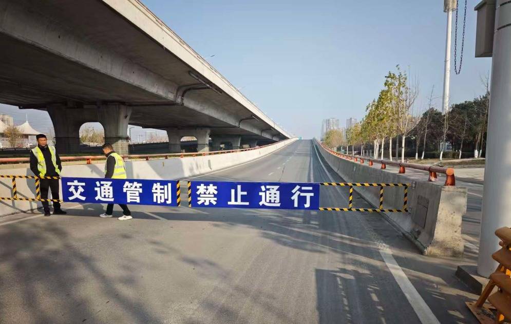 ▲襄阳交警在城市快速路各路段凹凸匝说念装配物理闸栏,将融雪剂等物资先期投放到匝说念相差口位置。