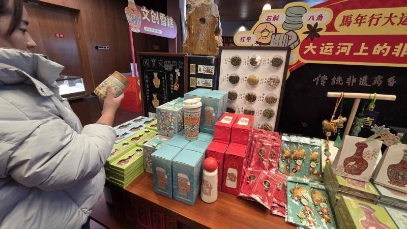 走进大运河博物馆文创店,马年新品摆放在门口的显眼位置。其中,有基于馆藏文物“京杭谈里图”蓄意的陶马丝巾、陶马硅藻泥地垫;基于馆藏文物三彩陶马蓄意的三彩陶马萌态画首饰套装、《三彩陶马》系列玛瑙首饰;基于馆藏文物汉白玉马蓄意的一马起始旋转雪柜贴、《汉白玉马》耳钉系列,以及基于馆藏文物伯矩鬲、铜坐龙、脊兽、三彩陶马蓄意的自然精油皂套装——国宝凝香皂物志礼盒等。